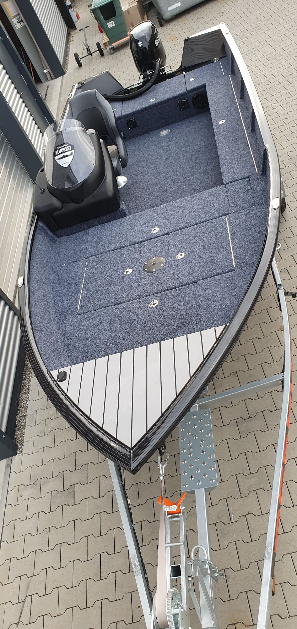 Das 4,90cm lange voll verschweißtes Aluminium Boot mit Teppich auf den Plattformen und EVA im Cockpit